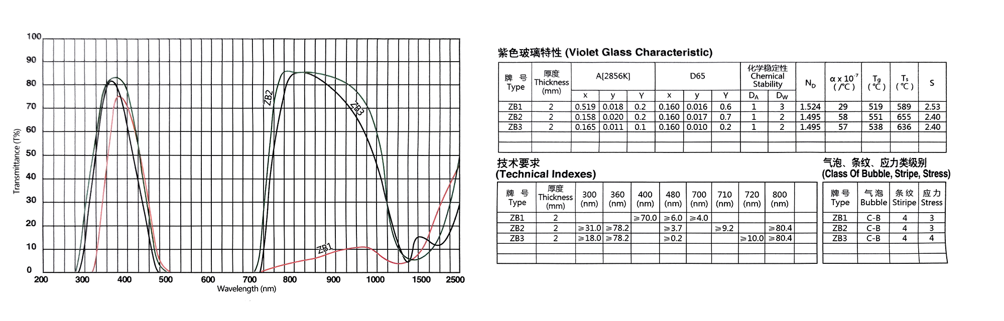 Transmissionskurve von optischem Farbglas der ZB-Serie
