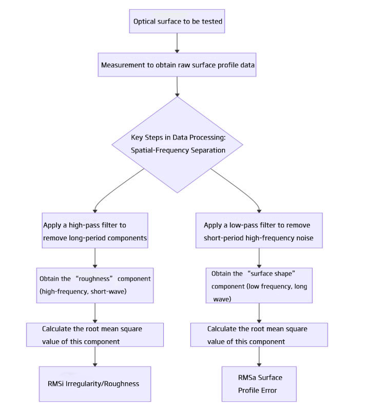 1. Separate Yet Coexisting: The total error of an actual optical surface comprises multiple frequency components, including RMSa (low-frequency), mid-frequency errors, and RMSi (high-frequency). Comprehensive characterization requires analyzing its power spectral density.